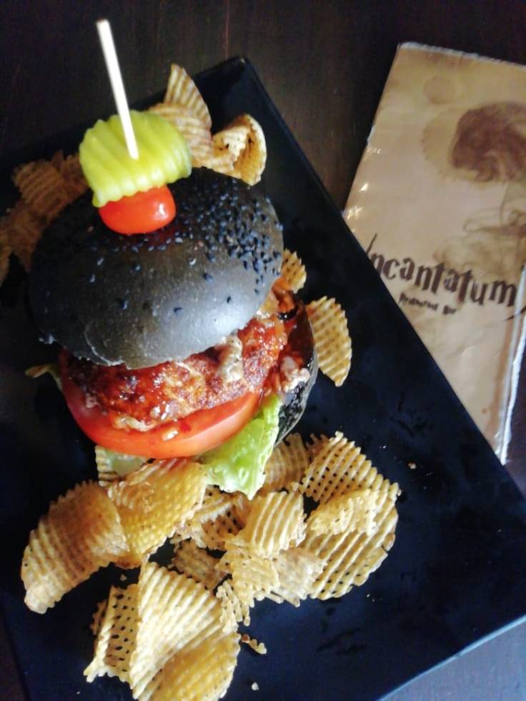 En Tacubaya encontramos un lugar con inspiración en Harry Poter, se llama @incantatum, sus platillos tienen nombres sacados de estos libros, su hamburguesa Samhain con su pan negro, carne rellena de queso mozarella, cebolla caramelizada, jitomate, lechuga y una salsa thai y papas chips wafleadas es una buena decisión para entrar en ese mood, nos gustó mucho, su carne en un término medio es jugosa y el queso le aporta mucho sabor.