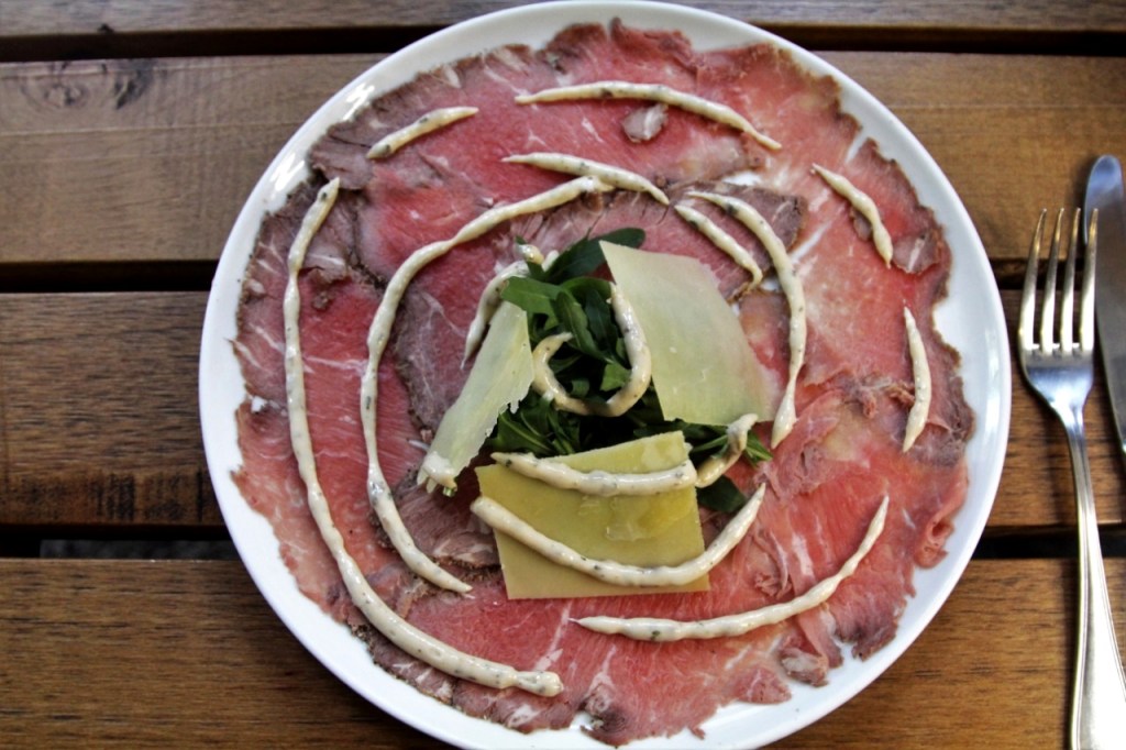 Ya en la mesa nos ofrecieron algo de beber, ella una copa de vino de la casa, como estaba haciendo calor yo pedí un bull, coctel que lleva ron, cerveza, jugo de limón y jarabe natural, de entrada un carppacio de rost beef, salsa de anchoas con arugula y láminas de queso parmesano, después ya pedimos la pasta que les contamos y el filete chemita, con su puré y bañado de un delicioso jugo de carne, como ya me había acabado el bull y estábamos en plan tranquilo pedí una limonada super fresca para el calor que estaba haciendo.