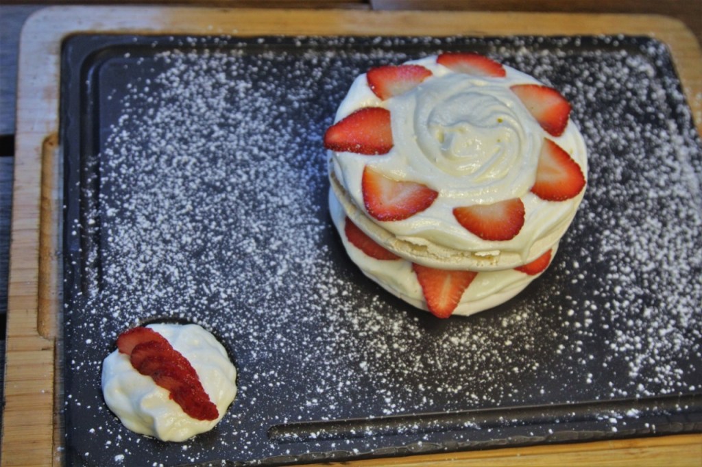 De su carta de postres nos recomendaron el merengue, merengue natural relleno de queso mascarpone, crema batida y fresa y 2 cafés americanos.