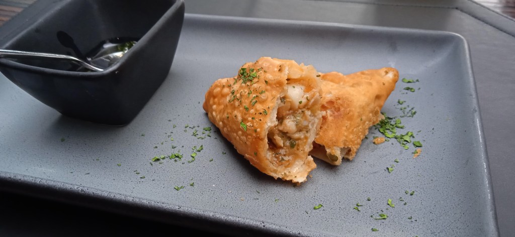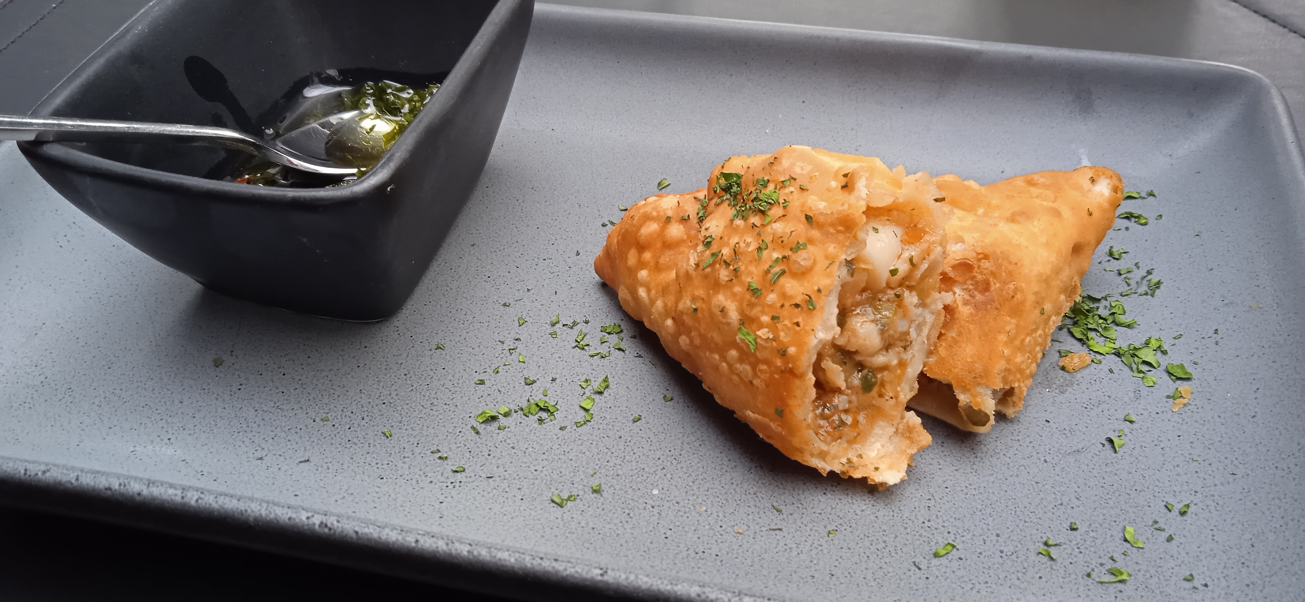 podrá abrir sus sentidos comenzando con una empanada de robalo a la biscayne, preparada con aceituna, alcaparra y jitomate, esta entrada emula los sabores típicos de España de la península Ibérica. Se acompaña de chimichurri a base de perejil, ajo, aceite, orégano y chiles dulces.