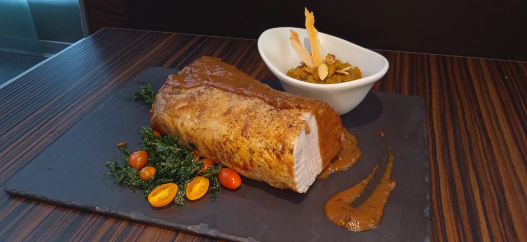 secos y arándanos o bien, pierna de cerdo en dos variedades: a los 3 chiles o a la ciruela y vino tinto.