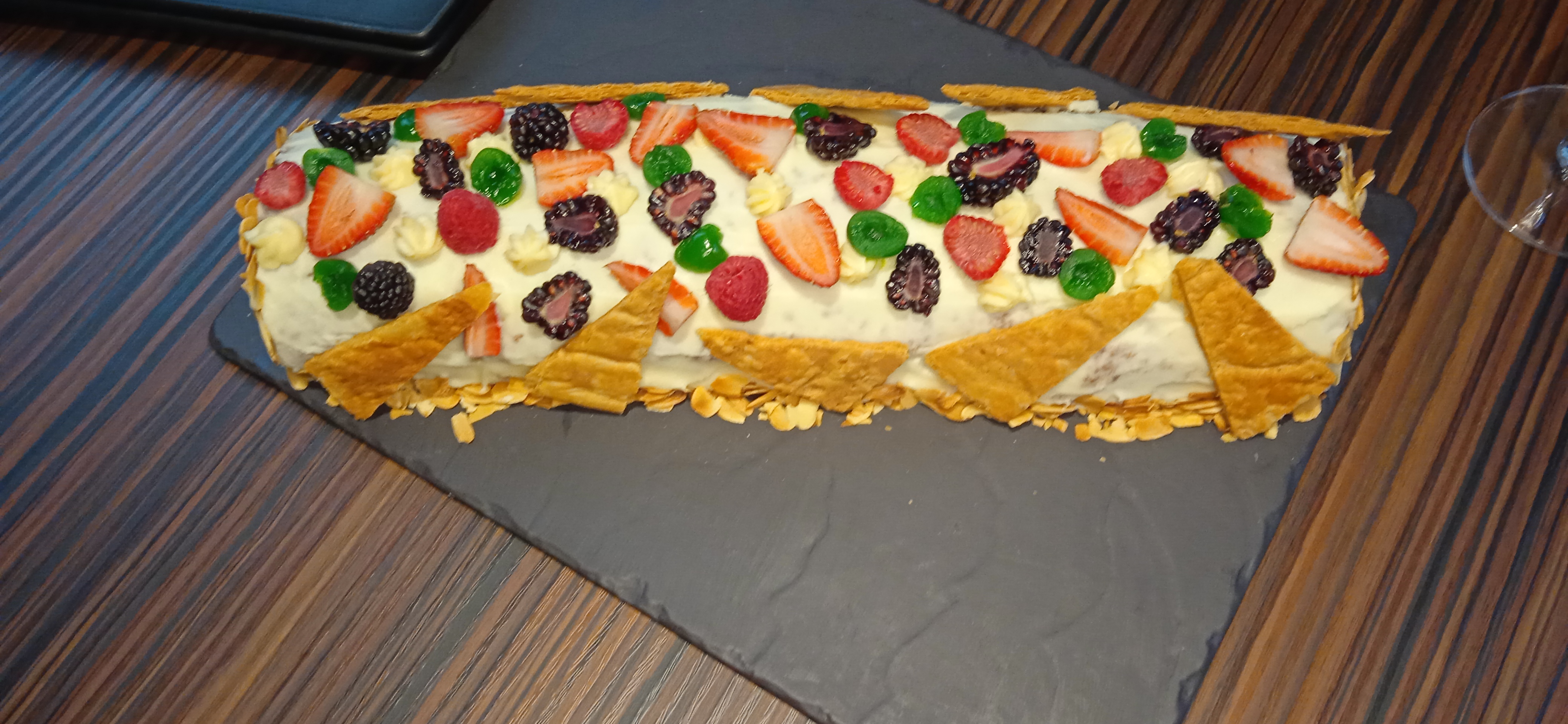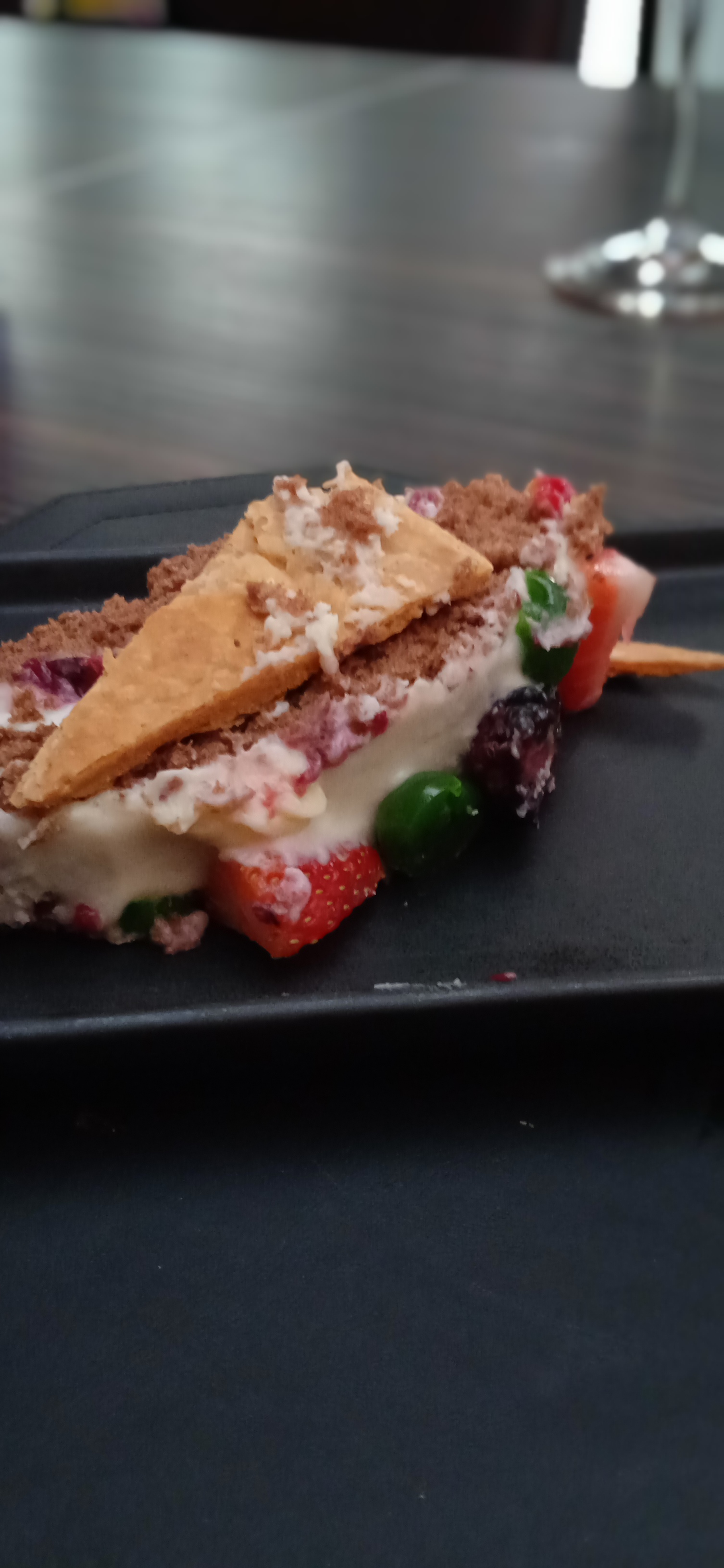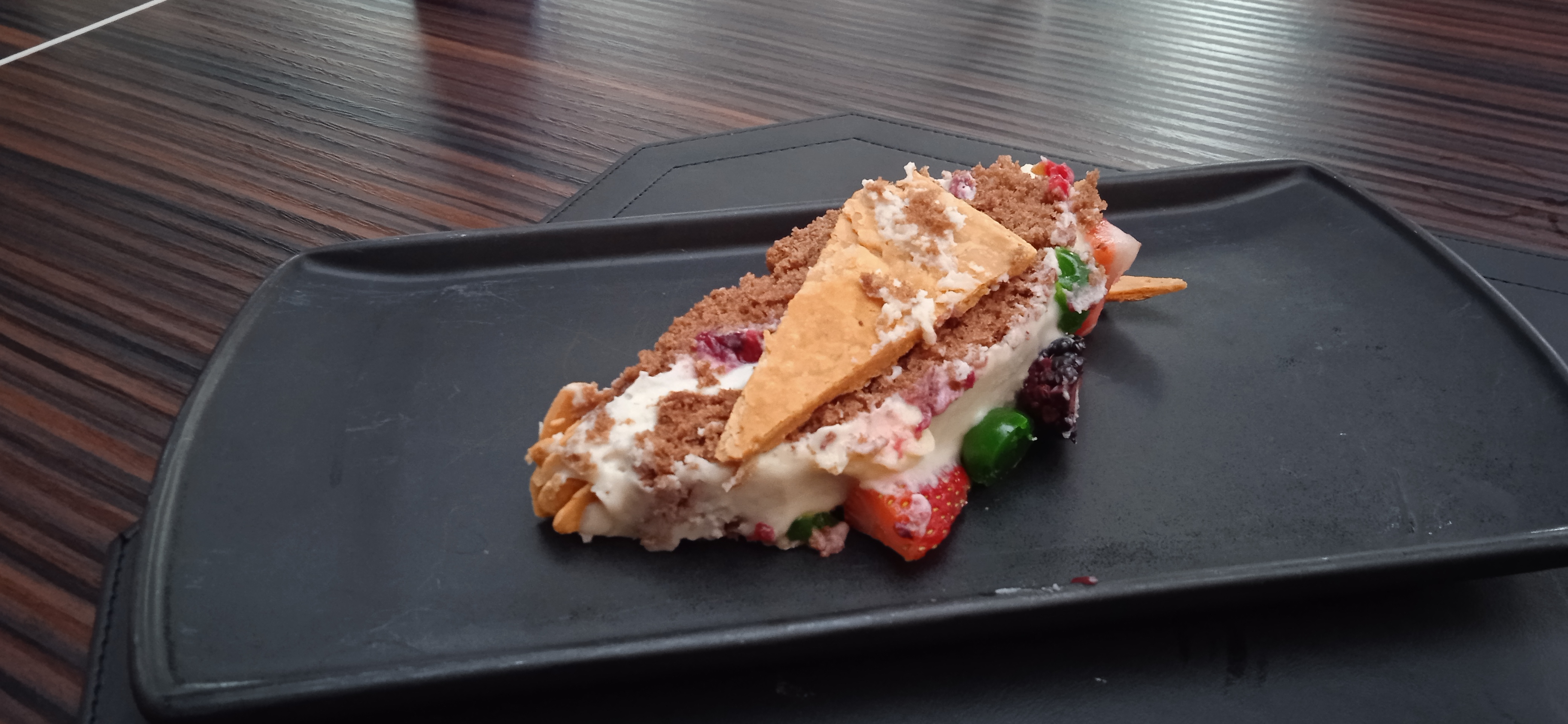 Para el postre, se puede degustar uno muy especial, el “Tronco Navideño”, que realizan con biscocho de cacao relleno con mermelada de frutos rojos, cubierto con ganache de chocolate blanco, crujientes de mil hojas y almendra tostada.