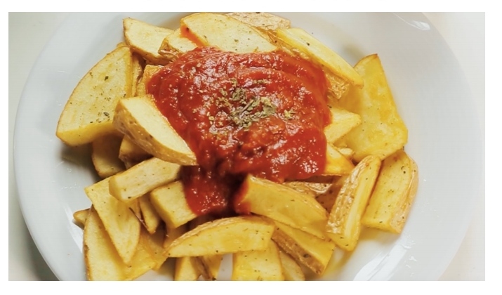 7. Sirve las papas fritas en un bowl y báñalas con Hunt’s® salsa para pasta estilo Bolognesa, encima espolvorea orégano y queso parmesano rallado.
