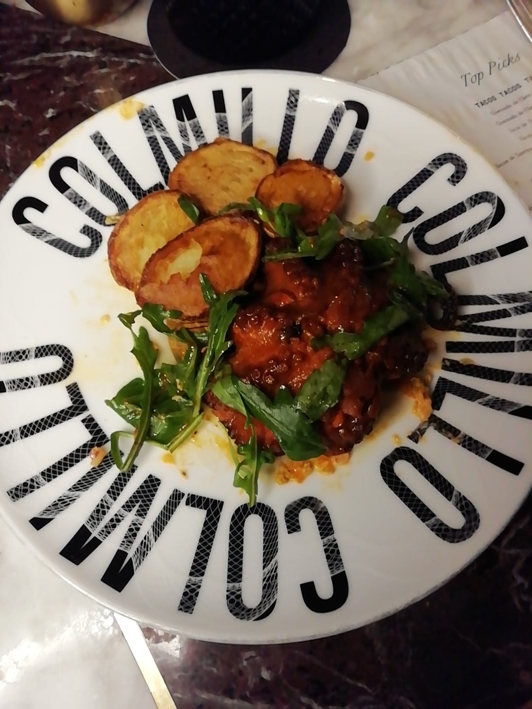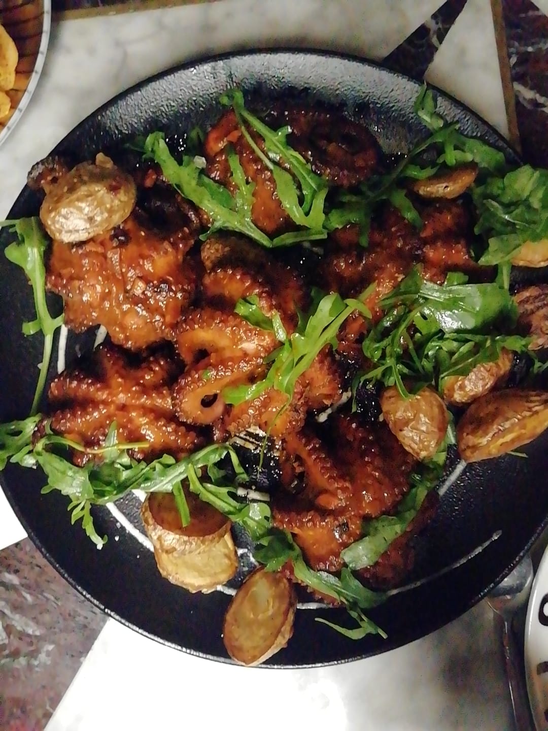 Seguimos con unos tacos de camarón al ajillo en costra de queso, y el pulpo a las brasas en verdad merece una mención aparte, es delicioso, su cocimiento es perfecto muy suave, y su sabor el mejor pulpo que hemos probado.