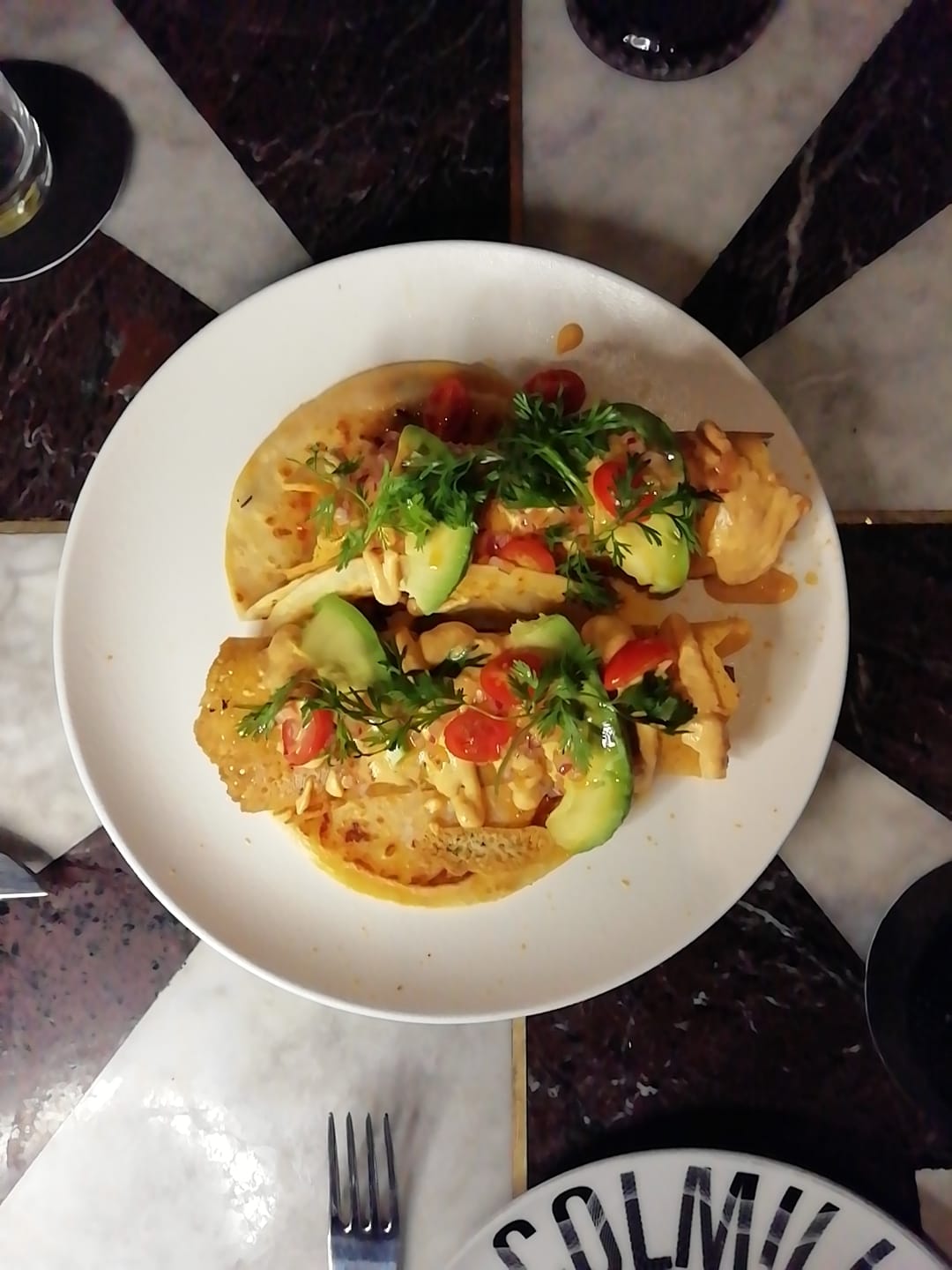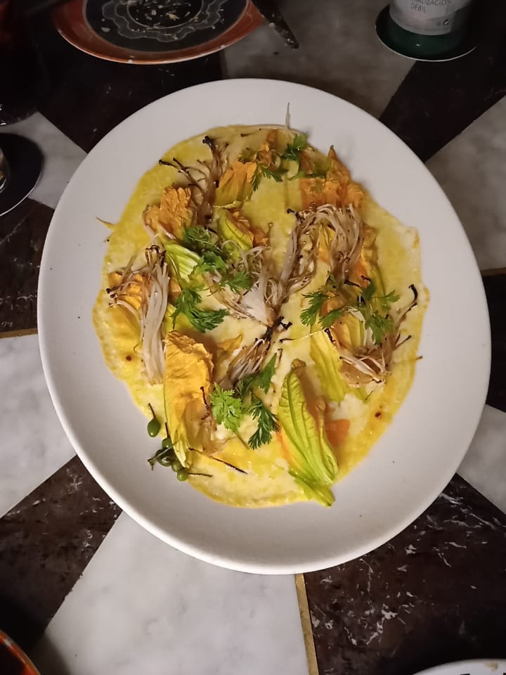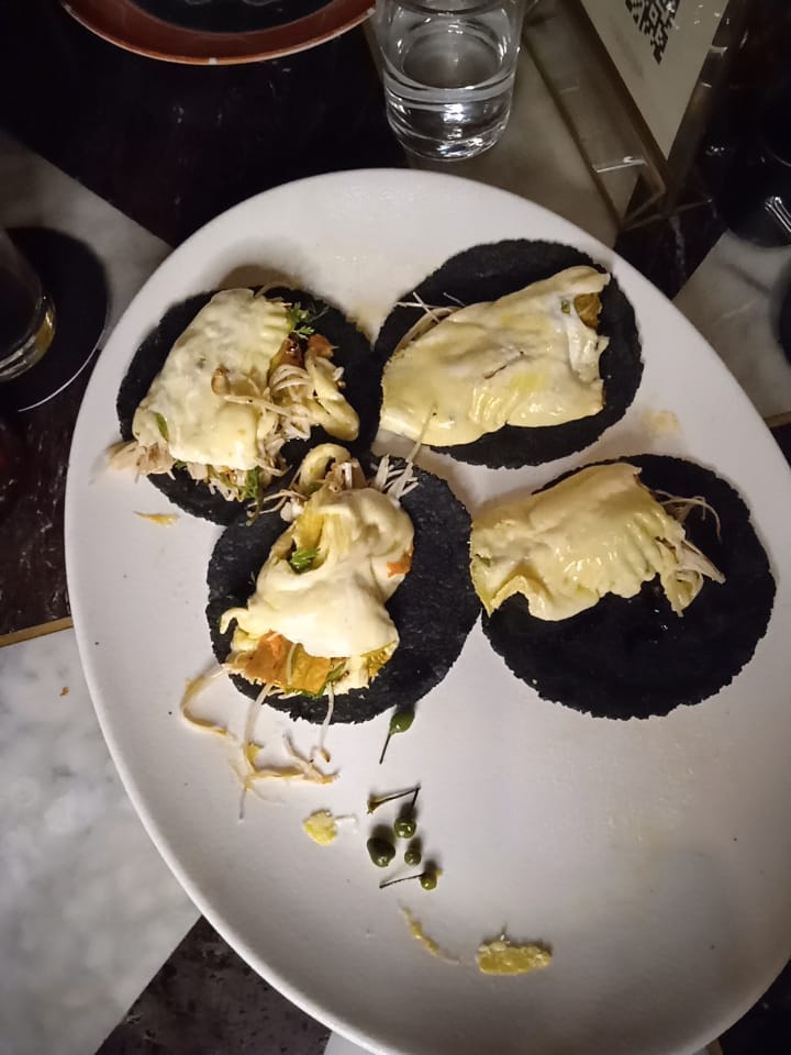 Después llegó un queso fundido con flor de calabaza y enokis, los enokis pertenecen a la familia de las setas son alargadas blancas y sofisticadas como todo en Colmillo, después de presentarlo en la mesa el mesero se encarga de preparar unos tacos en tortillas negras.