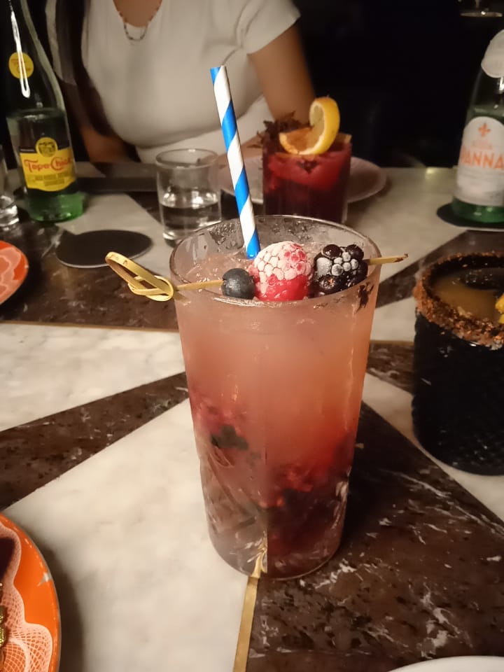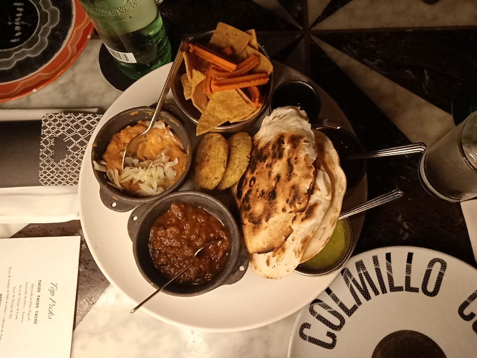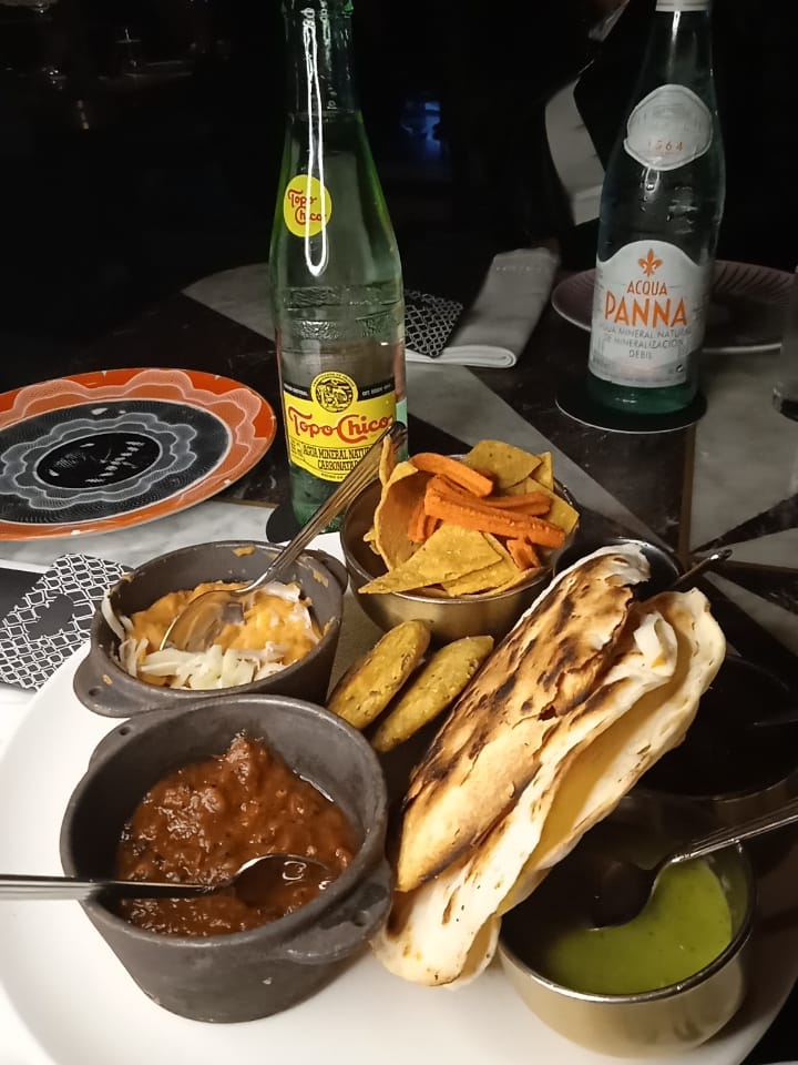 Para comenzar llego a la mesa un platón con tostadas, salsas y unas pequeñas gorditas, nuestro mesero nos contó cuáles salsas eran y cuánto picaba cada una, también llegaron los cócteles que habíamos elegido.