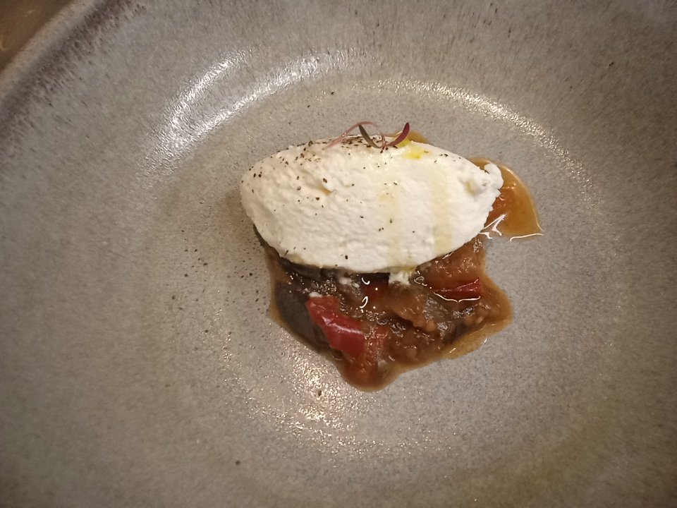 Como segundo plato una Caponata di Verdura, un platillo creado en Sicilia de verduras finamente cocidas, con una burrata encima, un queso muy ligero y de textura muy cremosa.