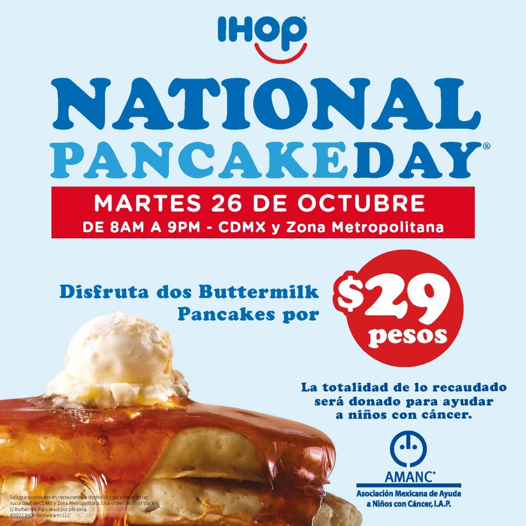 El 26 de octubre todos los restaurantes IHOP de la República Mexicana, estarán ofreciendo los mundialmente famosos Buttermilk Pancakes a un precio especial de $29.00 pesos*. Lo recaudado durante este día será donado en su totalidad a la Asociación Mexicana de Ayuda a Niños con Cáncer (AMANC), así como a las organizaciones locales con las cuales ésta trabaja.