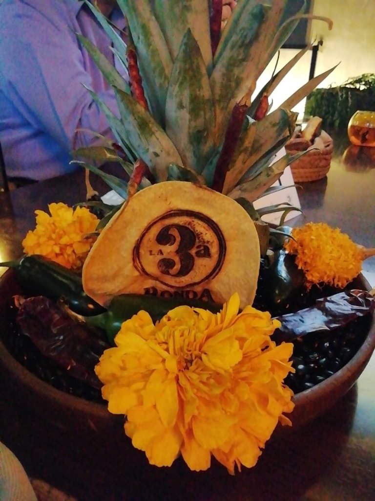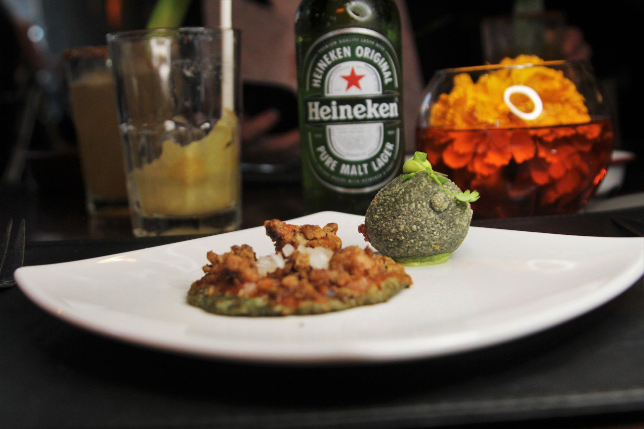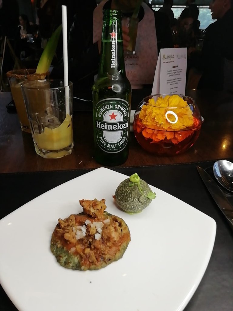 Antes del Huaxmole únicamente se sirvió una pequeña entrada de Chalupas de suadero y una Inflada de Chicharrón. Para dar paso al platillo principal, acompañado por los cocteles que puedes disfrutar habitualmente en la 3ª Ronda, como el Corazón de Mezcal elaborado con Mezcal Montelobos y con un toque dulce de una piña asada.