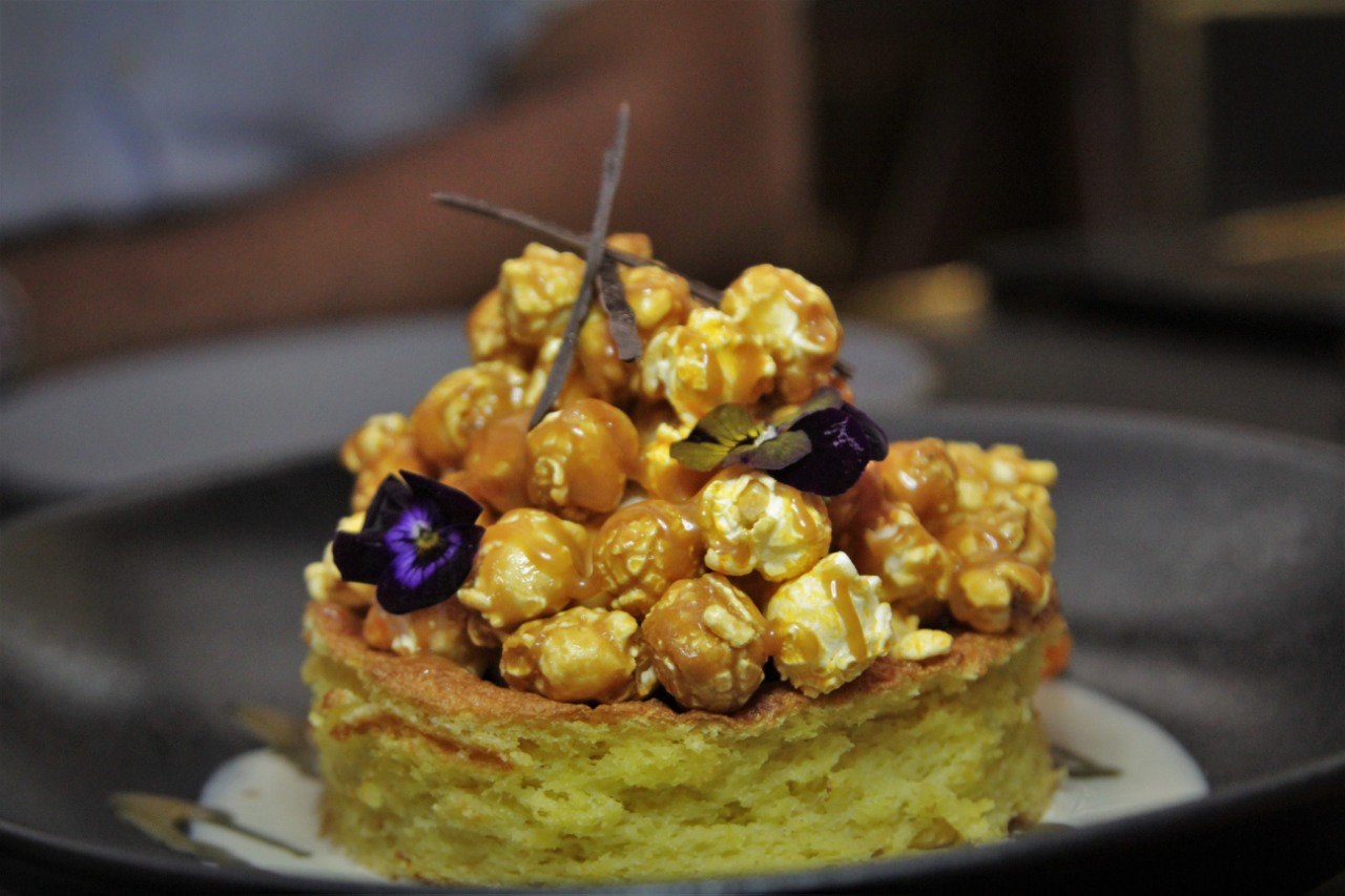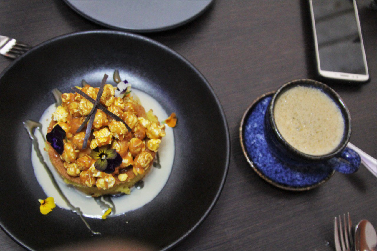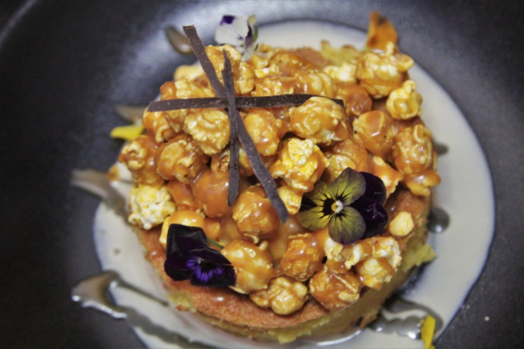 De postre pedimos el pan de elote con Baileys, acompañado de helado de vainilla vegano, que aunque era vegano se sentía cremoso, y coronado de palomitas de queso cheddar caramelizadas.