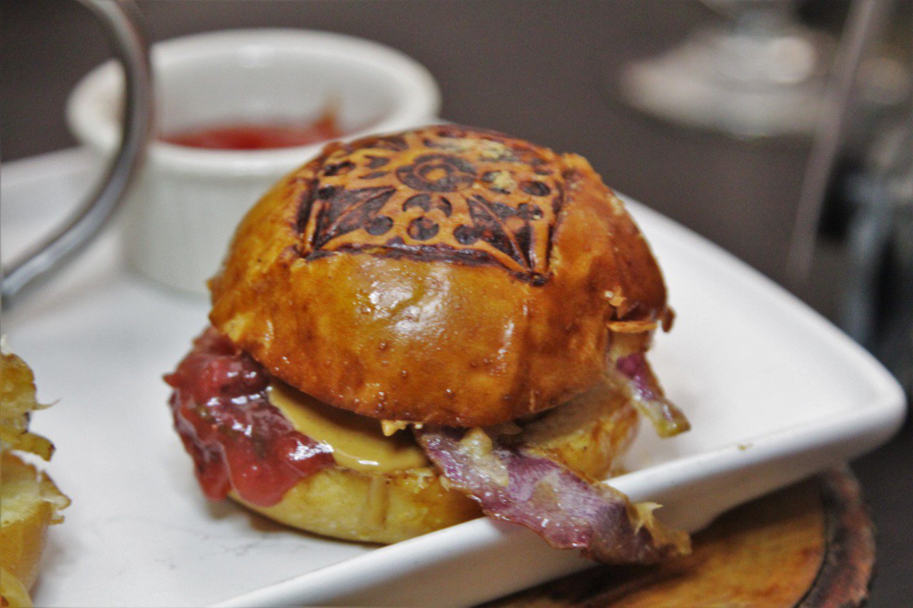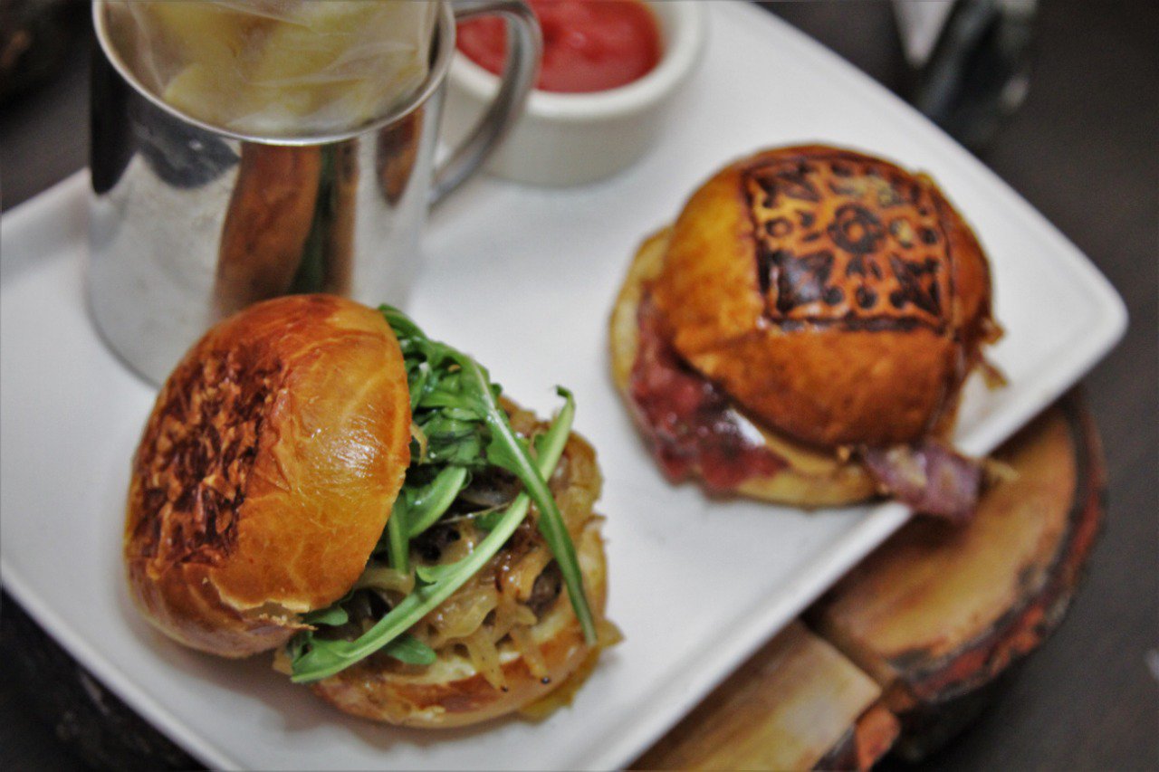 Para terminar las mini sliders, 2 hamburguesas pequeñas, una con carne molida de res, queso cheddar, mantequilla de cacahuate, tocino, aros de cebolla y aderezo de fresa que fue una agradable sorpresa la combinación de sabores, los 2 opinamos que la crema de cacahuate aportada una untuosidad y sabor riquísimo, y la otra slider, la hamburguesa Carmina, molida de res, queso provoleta ahumado, jitomates deshidratados, cebolla caramelizada, y arugula, venían acompañadas de papas fritas, estás sliders las puedes encontrar los domingos en el brunch.