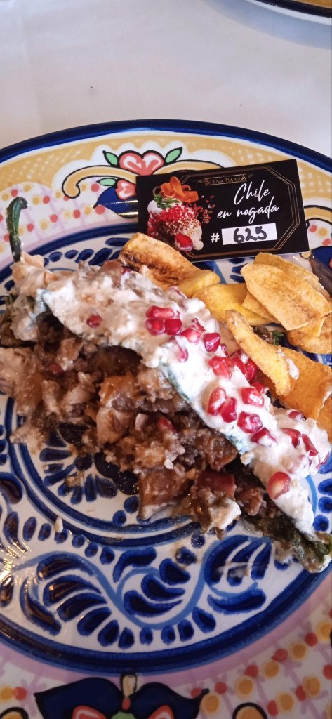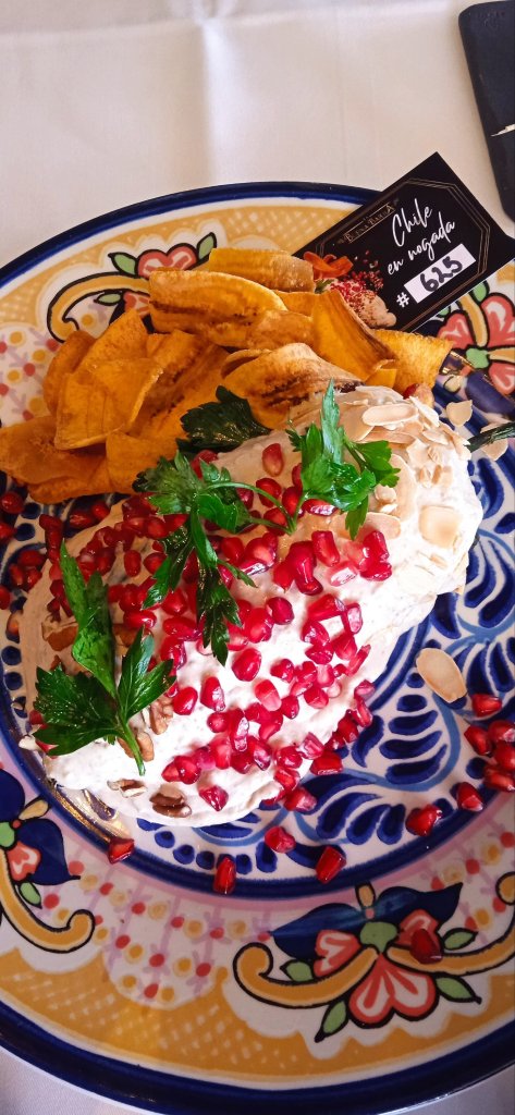 Dicen que primero comes por los ojos y con este chile seguro que es así, es un chile grande con un relleno de 400 gramos de filete, frutas como la pera, durazno, manzana, nuez y bañado de la salsa nogada es espesa y cremosa es una salsa en la que te encuentras tropiezos de nuez de Castilla para asegurar su autenticidad, por encima de la nogada lleva granada y perejil y lo presentan acompañado de rebanadas muy finas de platano macho dorado, para asegurar su calidad cada chile viene numerado, así puedes saber cuántos chiles ha preparado el chef antes del que tú estás degustando.