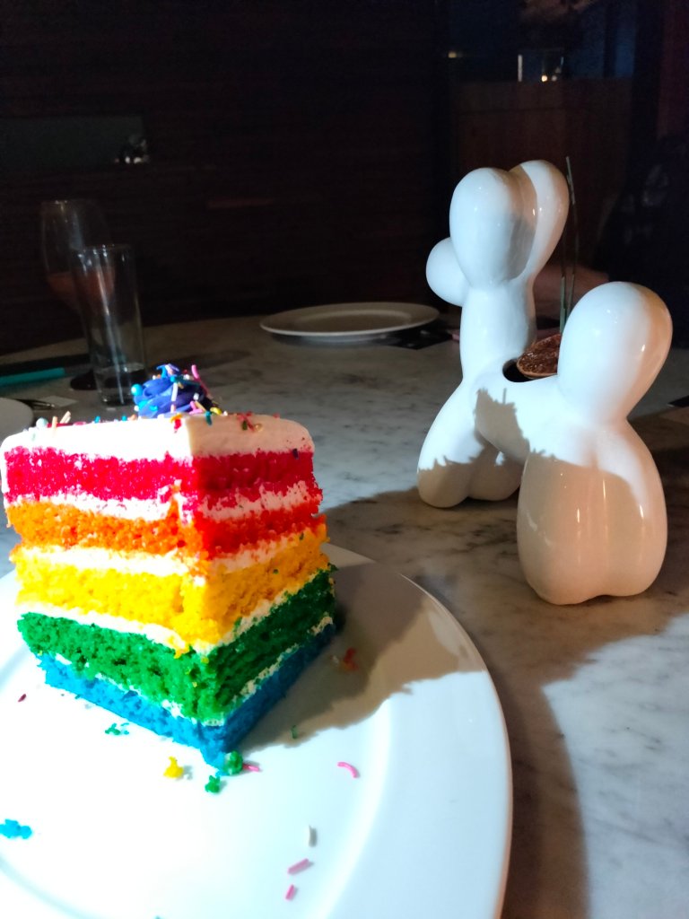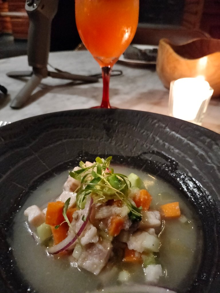 Comenzamos la noche por un ceviche que en sus comienzos lo tuvieron en la carta luego cambiaron menú pero sus clientes lo pedían y ya regreso a su carta, después una crema de alcachofa, dicen que de la vista nace el amor y estos platos desde que llegan a la mesa ya nos habían encantado, después el plato fuerte el salmón unos de mis pescados favoritos por su sabor, una proteína que siempre que tengo la oportunidad en desayunos, comidas o cenas lo pido, para finalizar está cena de celebración una rebanada de un pastel de cumple, pastel con capas de distintos colores típico de las celebraciones de cumpleaños en Entrefuegos.