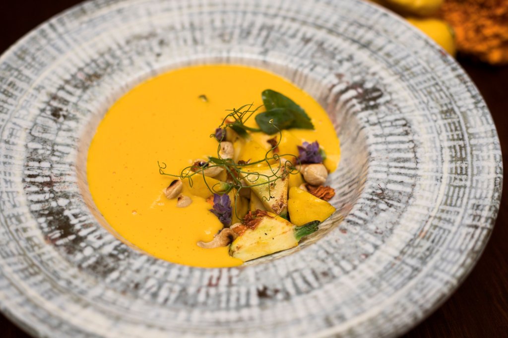 Crema de calabaza mantequilla tatemada 200 ml De textura cremosa, con perfume de azahar y sin lácteos, sedosa, con calabaza fermentada, nuez de la india tostada, un toque de polvo de cempasúchil y aceite de lavanda.
