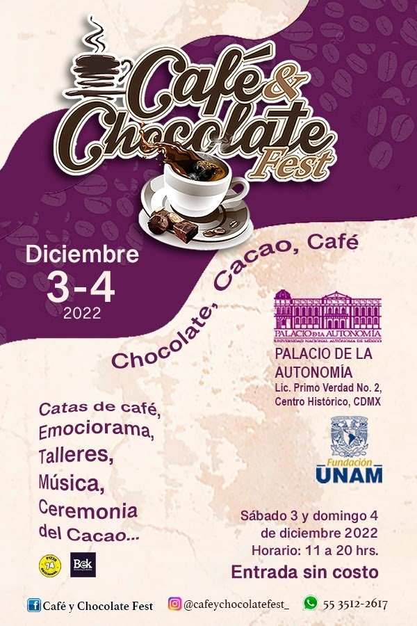 CAFÉ & CHOCOLATE FEST es un evento familiar que se ha distinguido por promover a nivel gastronómico y cultural, dos deliciosos productos de gran valor nutricional e histórico, impulsando el desarrollo económico de productores independientes y apoyando la educación en México. Este país cuenta con café, chocolate y derivados de estos dos productos, con calidad de exportación. Son básicos en la dieta del mexicano y muchos de ellos se podrán adquirir a precios muy accesibles en este festival que se llevará a cabo los días sábado 3 y domingo 4 de Diciembre de 11 a 20 horas, en el PALACIO DE LA AUTONOMÍA DE LA FUNDACIÓN UNAM, ubicado en calle