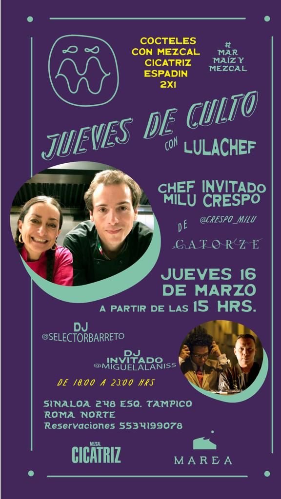 *Las colaboraciones entre amigos los Jueves de Culto, no paran, son deliciosas y divertidas, en marzo, la chef Lula Martín del Campo tendrá como invitado a Álvaro Crespo chef ejecutivo de Grupo Castizo.