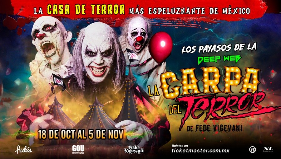 La Carpa del Terror de los Payasos de la Deep Webe estará abierta del 18 de octubre al 5 de noviembre en periférico norte 1400 frente a la Manzana de Roma. Cuenta con estacionamiento. Los boletos estarán a la venta en Ticketmáster y taquillas de la carpa. El precio general es de $350.
