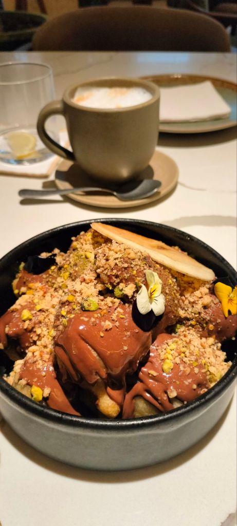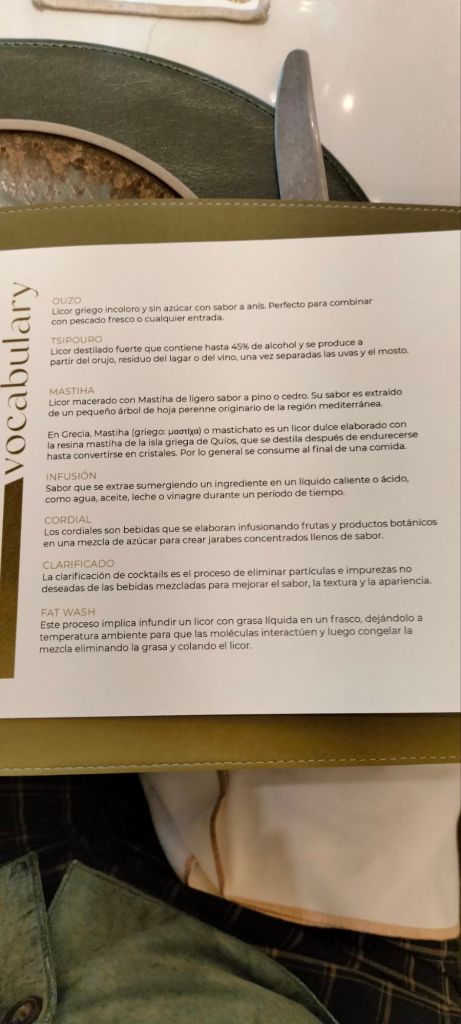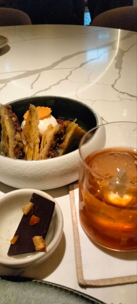 Para finalizar pedí uno se sus cócteles dulces enfriado con una bola de hielo que en su interior trae un pedazo de lámina de oro de 24 kilates y traía al lado en un platito un pedacito de chocolate con naranja, y vaklava uno de los postres más tradicionales griegos y de mis postres favoritos del mundo mundial, venía acompañado de helado de mastiha otro sabor que me sorprendió yo decia que sabía a pino preguntamos a Jesús y nos dijo que efectivamente era un helado hecho de un licor llamado mastiha que es sacado de la resina de un árbol que es originario de Grecia y tiene denominación de origen, también pedimos lokuimades son unas bolitas tipo centros de dona bañados de crema de avellanas.