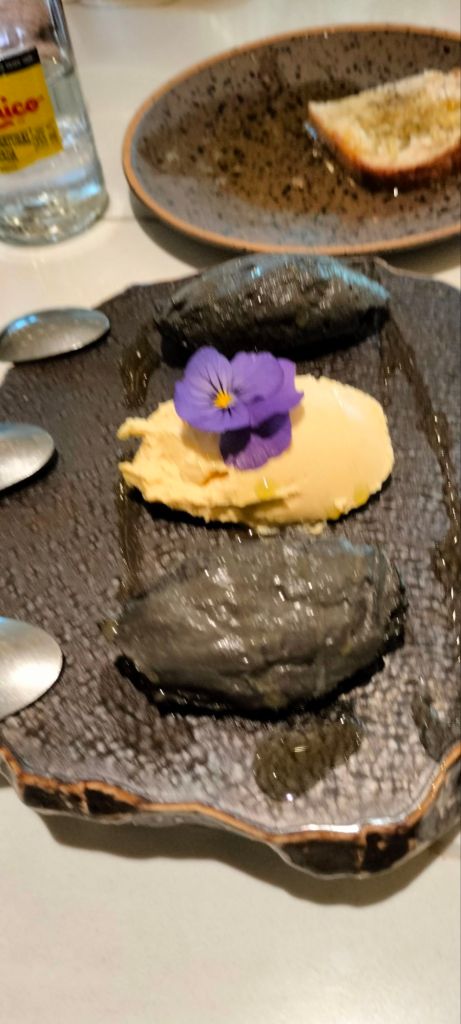 Para comenzar nos dieron a escojer de su variedad de panes, pedimos el blanco de masa madre con aceitunas el que rebanaron en nuestra mesa y nos enseñaron como se come el pan en grecia con mucho aceite de oliva y orégano.