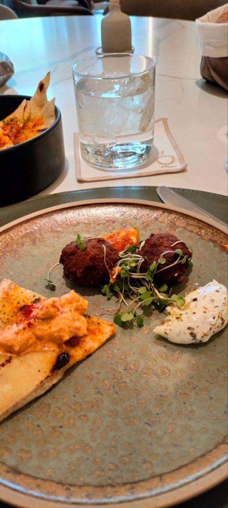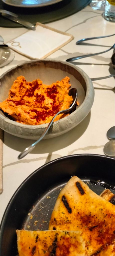 De entradas escogimos el Tirokafteri una crema de selección de quesos, puré de pimientos rojos rostizados y semillas picantes de pimiento algo que se nos hizo delicioso nos llevaron pan pita dónde lo untamos también pedimos taramosalata es un puré cremoso hecho con una emulsión de pasta de huevas de pescado lo hacen en 3 versiones distintas, para los que no están acostumbrados a este tipo de cocina se les puede hacer un poco fuerte el sabor, de sus entradas calientes pedimos keftadakia son unas bolitas de carne con crema de yogurt y aderezo de tomate picante muy buenas también.