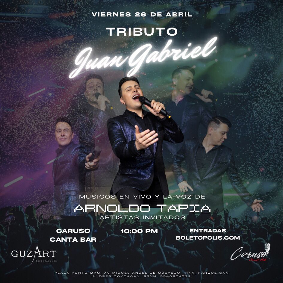 El “Tributo a Juan Gabriel” será presentado el próximo viernes 26 de abril a las 10 pm en Caruso ubicado en Plaza Punto Maq, avenida Miguel Ángel de Quevedo 1144, Parque San Andrés Coyoacán. Los boletos tienen un costo de $350 en preventa y $400 precio normal y se pueden adquirir en boletopolis.com