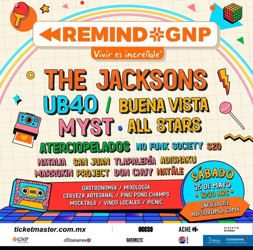 Una nueva edición de Remind GNP llega a la Ciudad de México este 25 de mayo, The Jacksons, UB40, Buena Vista, MYST, Aterciopelados son algunos de los artistas que engalanarán este fabuloso evento en donde todos los 80s y los que no pero que aman esa generación que dio grandes exponentes de la música que difícilmente alguna otra generación tendrá.