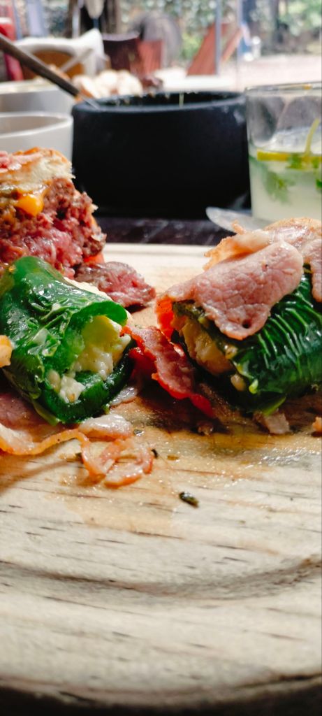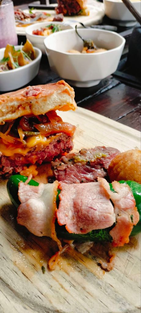 Comenzamos con unas canastitas de chistorra y queso y también unos frijolitos refritos, unos Jalapeños Pop $149.00, chiles Jalapeños rellenos de queso y envueltos en tocino fueron para acompañar una arrachera importada 350 gms $349.00 en termino medio y una hamburguesa 250 gms de carne Sterling Silver $339.00 con queso Gouda y tocino acompañada de papas a la francesa, desde ahora cuando me pregunten cual es la mejor hamburguesa que he comido sin duda recomendare la de The Grill Table.