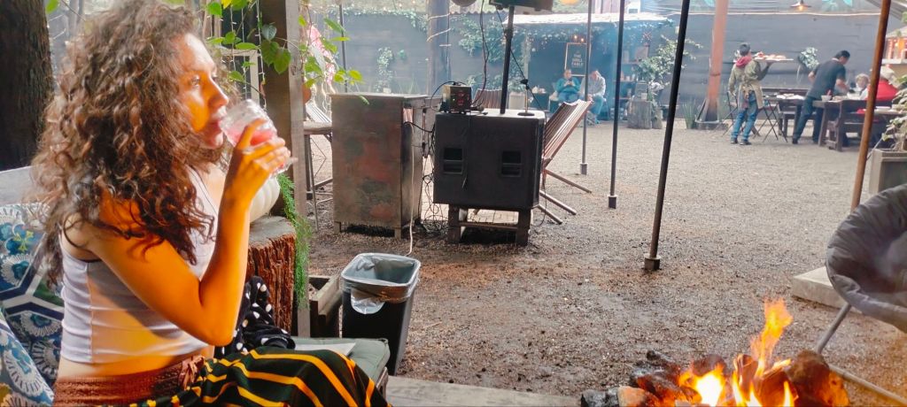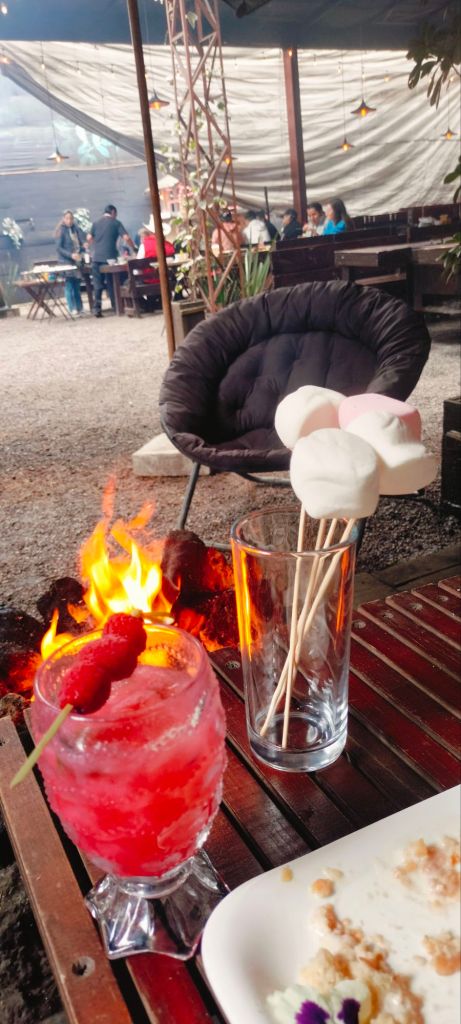 También un Mac and Chesse $129.00, un mojito y otro Trátame Suavemente $189.00 para seguir disfrutando de la tarde y pasarnos a el area de las fogatas y asar bombones y disfrutamos de un pastel «Migas de Manzana» $149.00 acompañado de helado, también ofrecen vino por copeo.
