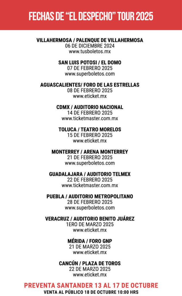 Ahora presentando un nuevo espectáculo, «El Despecho Tour 2025”, el cual está integrado por sus grandes éxitos, además de los mejores momentos del tour 2024 que sigue con fechas ‘Sold Out’ en todo el país y muchas sorpresas.