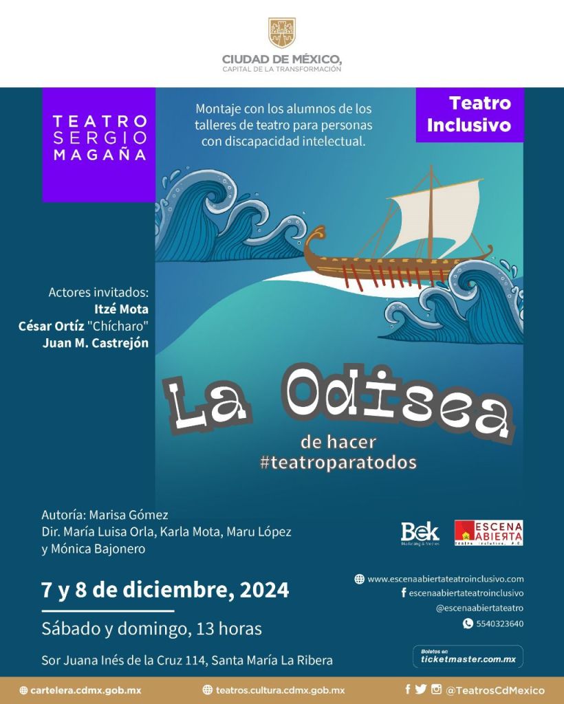 Por segundo año consecutivo, Sistema de Teatros de la Ciudad de México abre sus puertas a una propuesta inclusiva en la que se conjuga la participación de muchos generosos talentos; por un lado, más de 40 jóvenes actores con discapacidad intelectual y por otro lado, los actores invitados que los acompañarán en escena: Itzé Mota, César Ortiz “Chícharo” y Juan Castrejón, así como París Ramos en el diseño escenográfico, Alain Kerriou en la iluminación y Maro Wejebe en la coreografía y diseño de vestuario Proporcionando un espacio para desarrollar su creatividad e imaginación, María Luisa Orla, María Eugenia López, Karla Mota y Mónica Bajonero, dirigen una puesta en escena dinámica y divertida, basada en el mítico viaje de Odiseo rumbo a Ítaca, escrito por Homero en “La Odisea”, para el deleite grandes y chicos.
