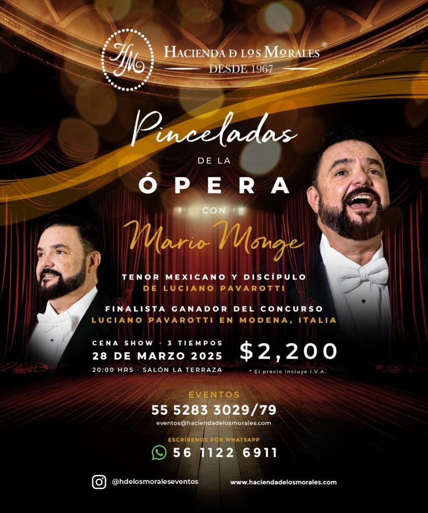 “Hemos diseñado este espectáculo de tal forma que el ambiente histórico y elegante de la Hacienda de los Morales, un lugar de tradición que ofrece el marco perfecto para una noche de lujo y emoción, se amalgame con la producción cuidada en cada detalle, garantizando con ello que la velada sea un deleite para los sentidos”, comenta José Carlos Félix, subdirector de Banquetes. “Lo que realmente distingue a “Pinceladas de la Ópera” es la oportunidad de disfrutar de una noche donde la ópera no es solo un género musical, sino una vivencia completa” continúa.