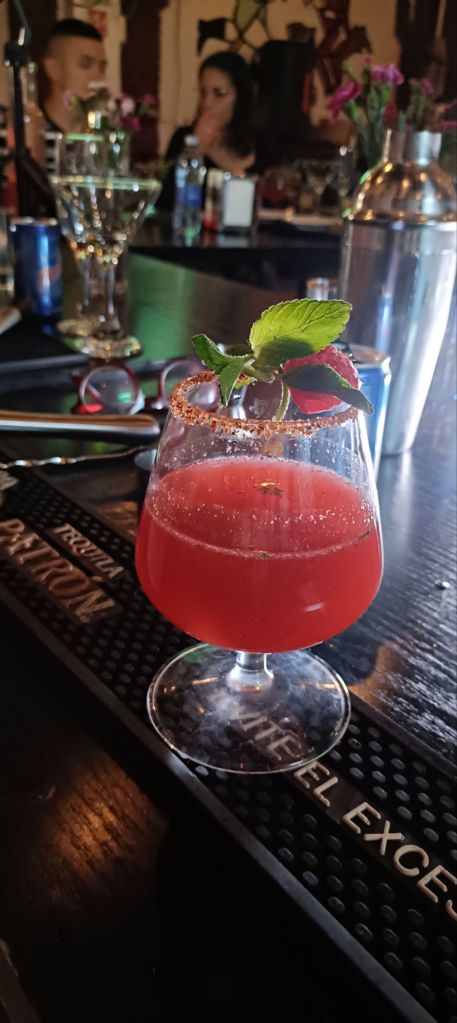 Empezamos con potencia. Este cóctel mezcla Mezcal, frambuesa, hierbabuena fresca y miel de agave, coronado con un top de agua mineral y sal de gusano.